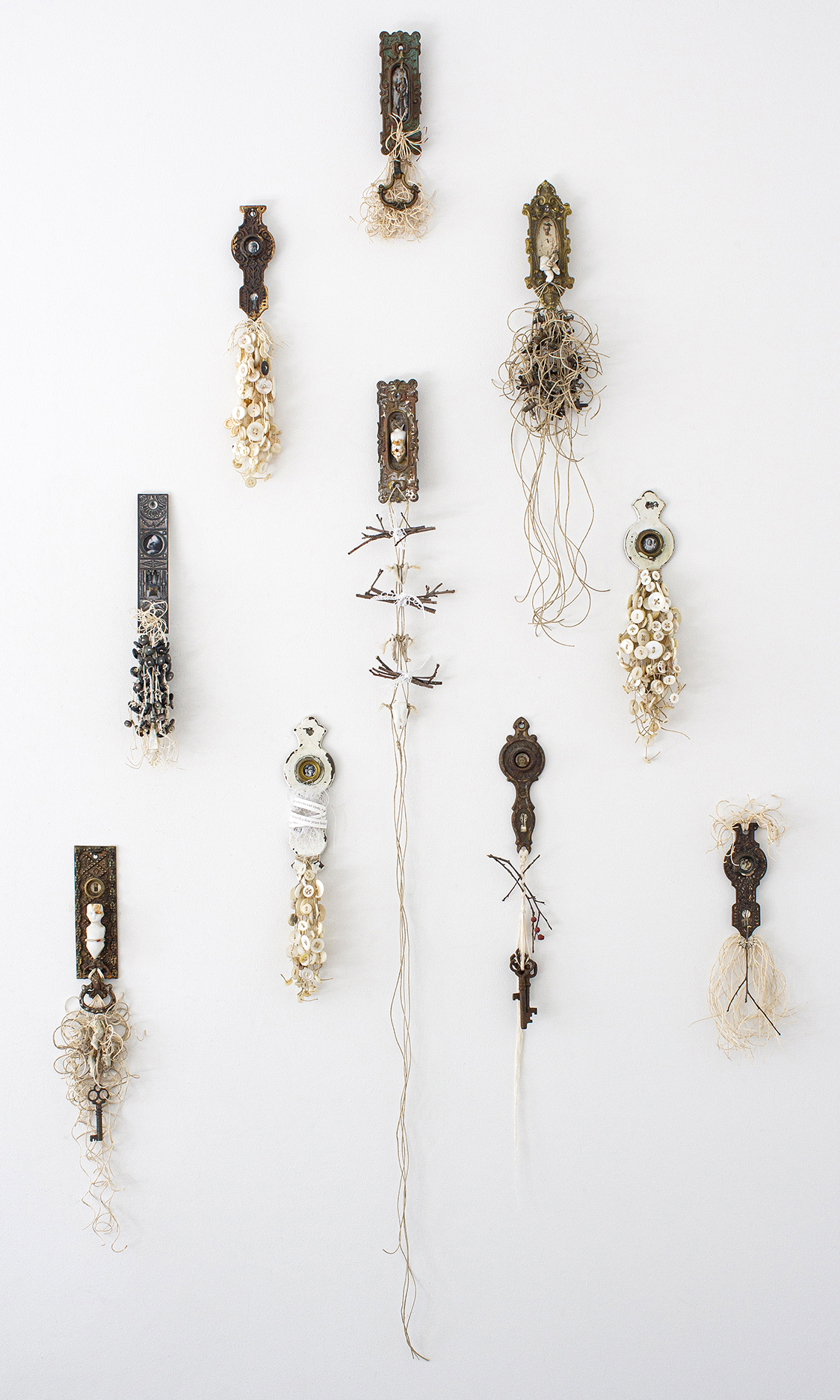 Laborious Work, Nimble Fingers explores the lost innocence of 19th century child textile workers. Through the sewing, knotting and reconnecting of seemingly unrelated antique materials, objects such as toy jacks, mother of pearl buttons, metal machinery keys and porcelain doll parts, are assembled into new and narrative forms that evoke a metaphysical quality of contemplation, along with the nostalgia of lost innocence. Held within each icon-like structure rests a haunting portrait of a child laborer that is seemingly trapped in time. Entranced by the portrait’s gaze, the viewer is left in a state of curiosity. Who were they? What happened? In seeking answers, the only option is to carefully investigate the materials that surround each photo. In doing so, the fiber functions a metaphor as the viewer’s eye moves from material to material, clue to clue in hopes of weaving together the figure’s identity in order to make their story whole again. |