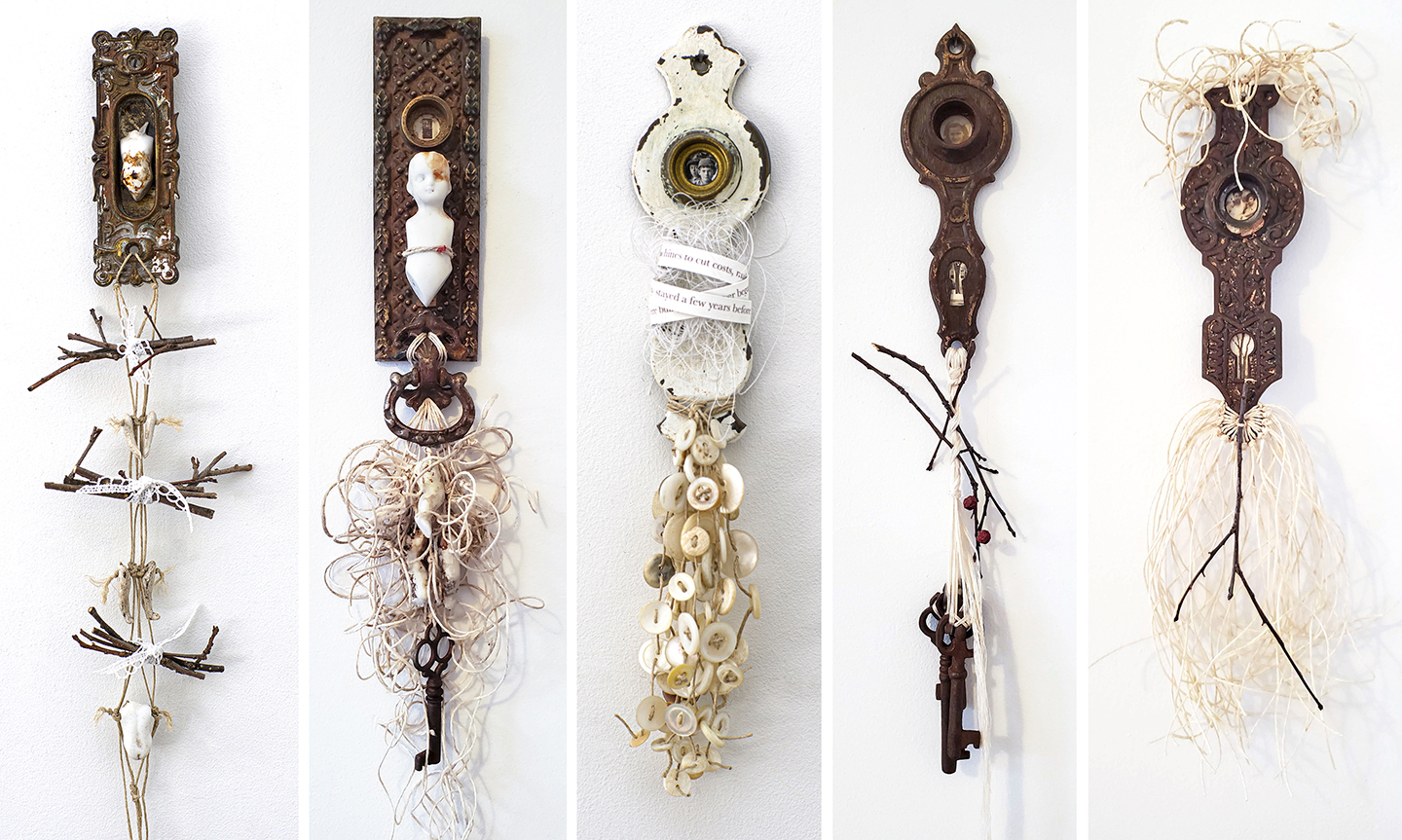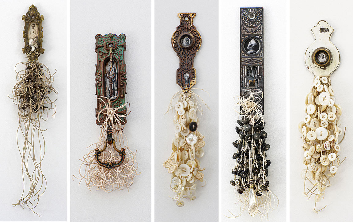 Bronze door back plates, found photos, mother of pearl + boot buttons, buttonhooks and hemp cord
